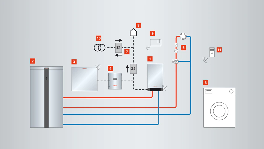 Nu intotdeauna energia produsă în regie proprie este consumat la fel. Pentru aceasta, sistemele de acumulare de curent Viessmann sunt soluția: se încarcă singure și furnizează curent electric atunci când este necesar – de exemplu pentru funcționarea mașinii de spălat.