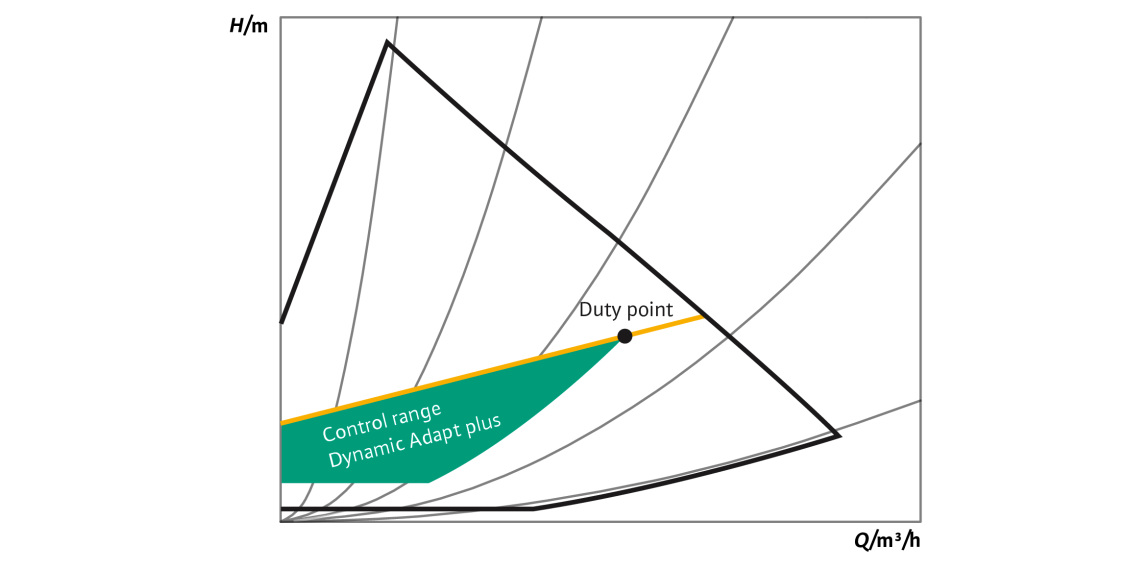 Az új beállítási funkció automatikusan a hidraulikus igényekhez igazítja a szállítófejet anélkül, hogy referenciaértéket kellene megadni. Az első üzembe helyezés után a Wilo-Stratos MAXO kiválaszt egy működési pontot a szivattyú működési grafikonjának közepén. A térfogatáram minden változása után új működési pontokat azonosítanak. Ennek a szabályozási módszernek az a célja, hogy a működési pontot úgy válasszuk ki, hogy a szelepek a lehető legszélesebbre nyíljanak. Ez lehetővé teszi, hogy a rendszer a lehető legkisebb nyomásveszteséggel működjön. A változó nyomásviszonyokhoz való alkalmazkodás automatikusan és függetlenül történik. Így akár 20%-os energiamegtakarítást érhet el a Δp-v szabályozási módhoz képest